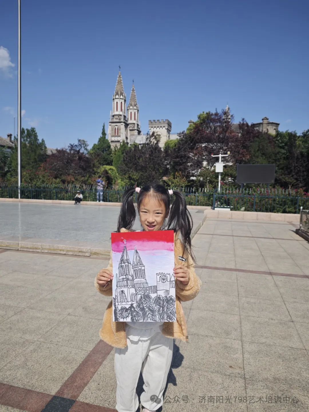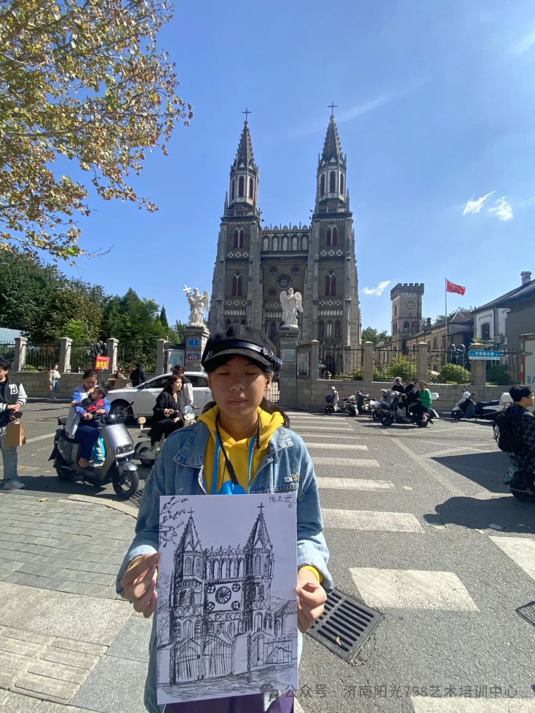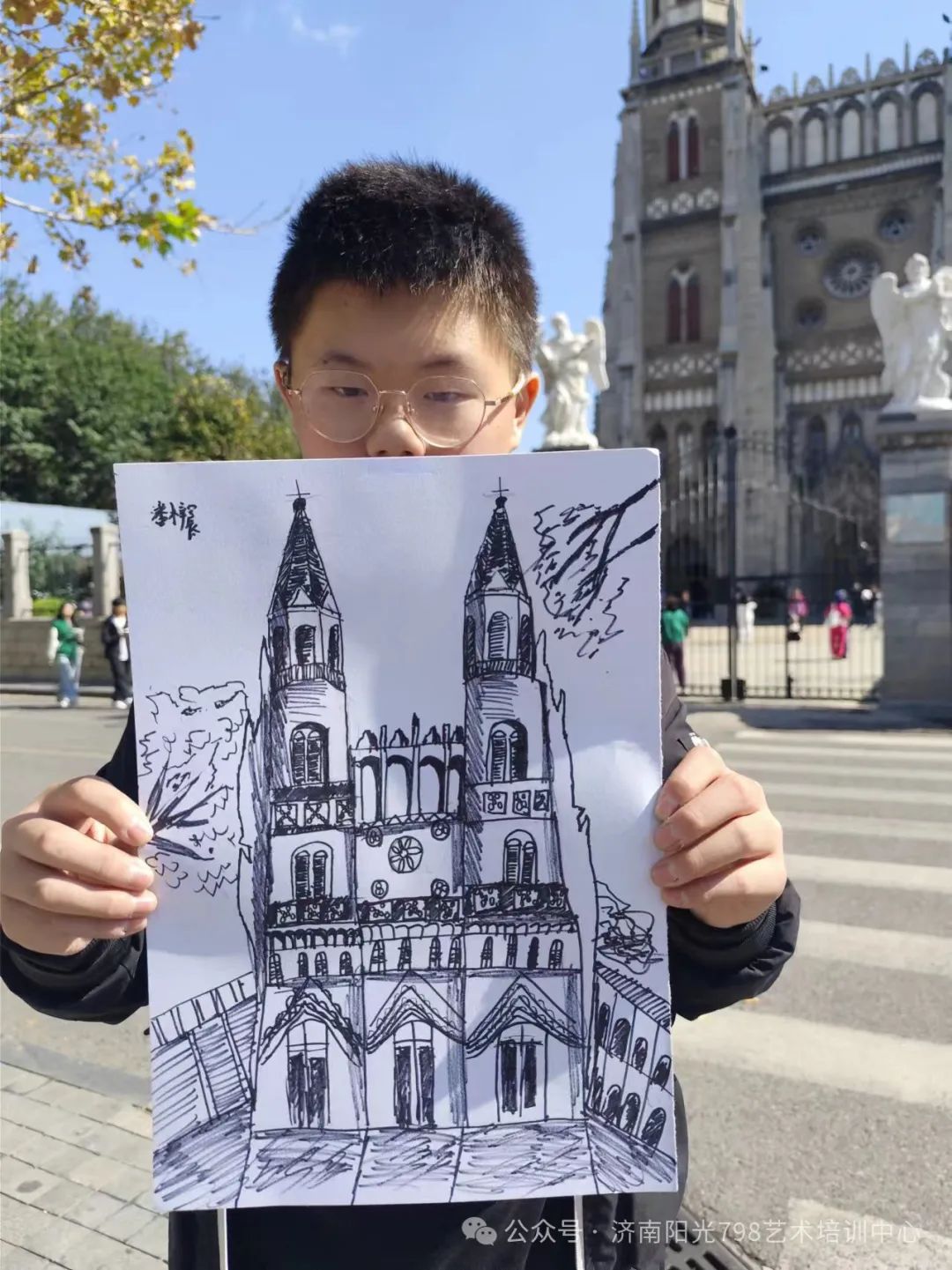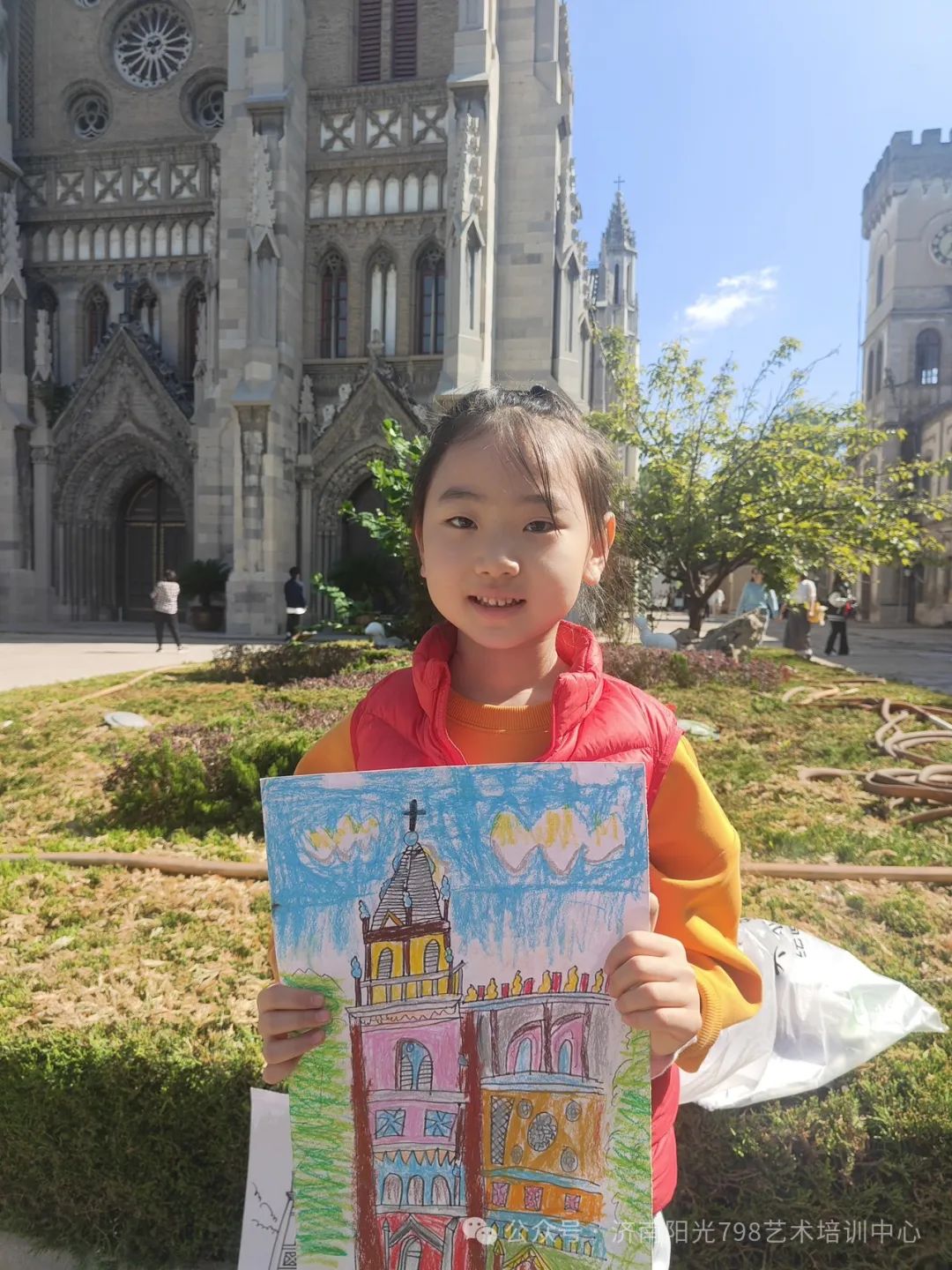 十月一日, 不需出远门, 去收获哥特式建筑庄严、肃穆、伟丽之美 洪楼教堂为双塔哥特式建筑, 教堂以洪家楼村而得名, 整座建筑给人气势如虹、精雕细刻、富丽堂皇之感。 ![]() 写生的过程是孩子观察、分析、理解、概括的过程,与模仿作画有着本质上的区别。孩子将自己的观察和思维概括地表现出来,这就是一种创造。